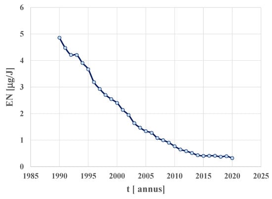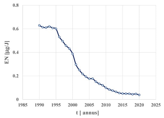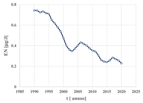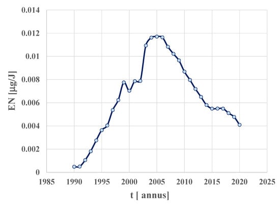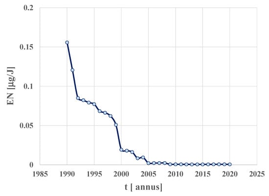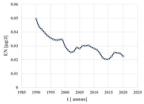 The linear trend of the derivative of the energy indicator of nitrogen oxides emission against time in relation to the national annual emission of nitrogen oxides is practically constant and negative. This means that, despite the great technical difficulties in reducing nitrogen oxide emissions, the developed methods are effective.