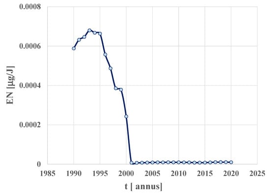 The linear trend of the derivative of the sulfur oxides emission index over time in relation to the national annual emission of sulfur oxides is negative and tends to increase. In the years 2004–2006, there was a significant decrease in the energy indicator of sulfur oxides emission due to a radical decrease in the share of sulfur content in fuels.