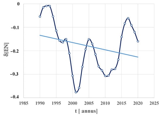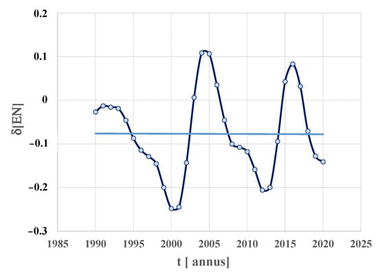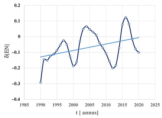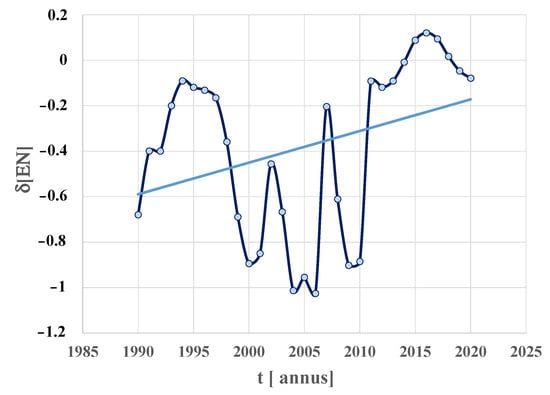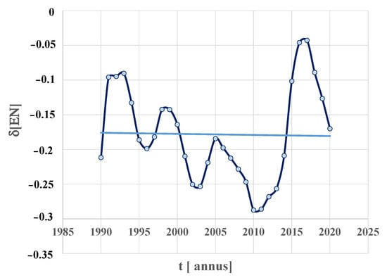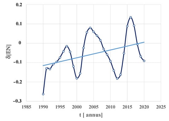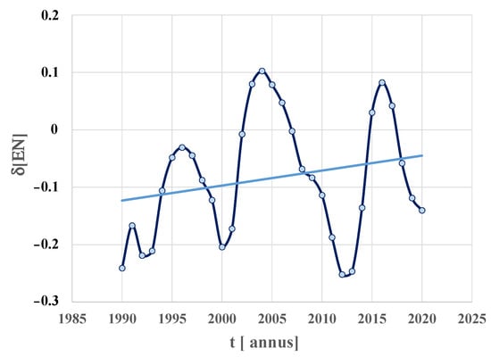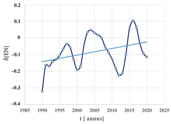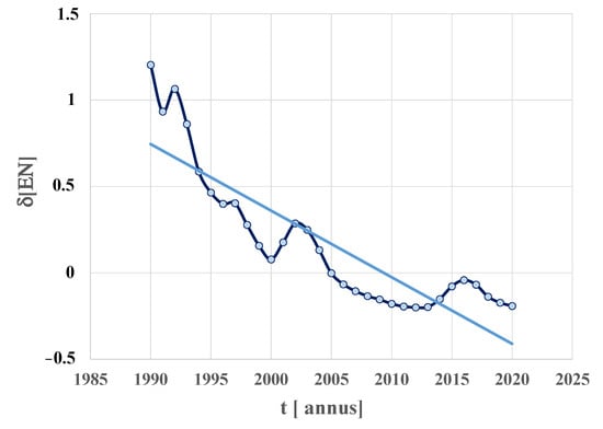 The relative derivative (δ [EN]) (black line) of the energy emission factor relative to the national annual emissions of nitrogen oxides (NOx) (blue line—linear approximation).