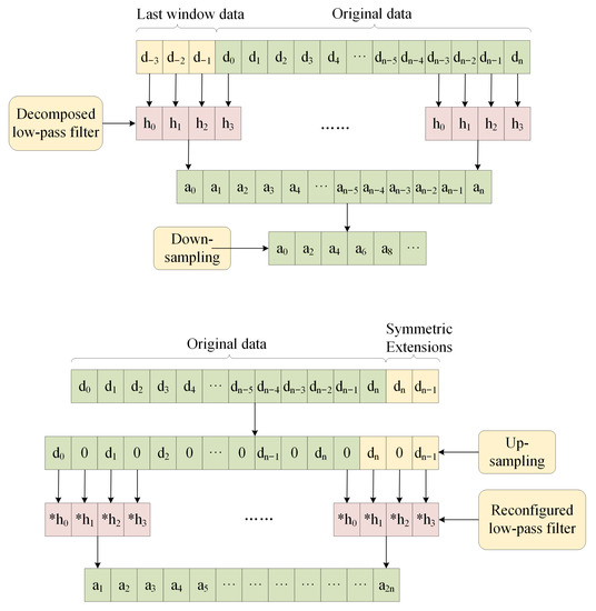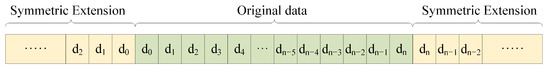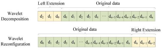 Real-time wavelet transform data are of infinite length, and a sliding window is commonly used in engineering to handle these types of data. Only a finite-length window of data is processed at a point in time, so boundary extension problems are inevitable. For real-time wavelet filters, the boundary effect is especially obvious. Traditional wavelet boundary extension methods include zero extension, periodic extension, symmetric extension, etc. Zero extension is simple in form and easy to apply, but the data produced is meaningless; it will not be discussed here. The periodic extension will destroy the consistency of signal boundaries [19,20]. The traditional symmetric extension is accomplished by mirroring the boundaries of the signal, as shown in Figure 2. The mirroring operation makes the signal symmetric at the boundary and eliminates sharp discontinuities at the boundary connections, which has an important practical significance [21]. The authors of [14] propose a left symmetric extension method during wavelet decomposition and a right symmetric extension method during wavelet reconstruction, as shown in Figure 3, which ensures both boundary continuity and a better filtering effect. However, no matter what kind of boundary extension method is used, there will be a boundary effect at the left boundary when the data of the front and back sliding window are spliced, which will cause errors in the waveform at the junction. Different extension methods are used to reduce the error. Therefore, this paper proposes an updated half-edge extension method. As shown in Figure 4, different from the left–right symmetric extension method in [14], the original previous data are taken as the extension values during decomposition. In this way, the left boundary can be avoided to produce boundary effects.