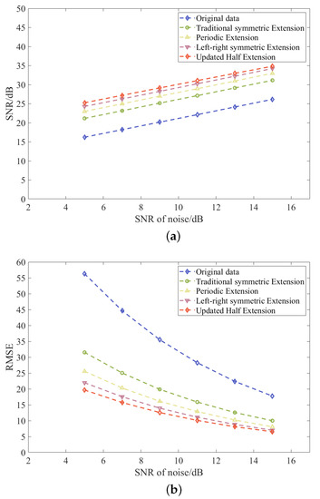 The SNR and RMSE of various types of boundary extension methods (traditional symmetric extension; periodic extension; left-right symmetric extension [14]; updated half extension) under different noise intensities. (a) SNR of various types of boundary extension methods. (b) RMSE of various types of boundary extension methods.
