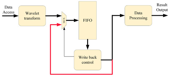 Wavelet transform has been widely used in engineering because of its excellent filtering effect. DSPs or computers are routinely used as its application platforms in engineering. Although DSP has excellent advantages in floating point operation, it still has some shortcomings in parallel execution. DSP cannot satisfy the real-time requirement when the calculation volume is large and the real-time requirement is high. Computers have excellent computational performance. Likewise, its disadvantages are significant, including large size, high cost, and being unfavorable for embedded deployment. FPGAs are often used as hardware acceleration platforms for various algorithms because of their high performance, low latency, and reconfigurability properties [22,23,24]. To further enhance the real-time performance of the algorithm, FPGAs are used as the hardware acceleration platform for the filtering algorithm, and the hardware acceleration structure of parallelization and pipelining of the wavelet transform algorithm is studied. The overall time consumption of the filtering algorithm is effectively reduced compared to the traditional serial execution method. In addition, for the characteristics of wavelet transform and signal, a wavelet loopback transmission structure is proposed to avoid repeated calculations, as shown in Figure 7. The overall time consumption of the FPGA-based scheme is effectively reduced compared to the traditional DSP and the computer implementation of square failure.