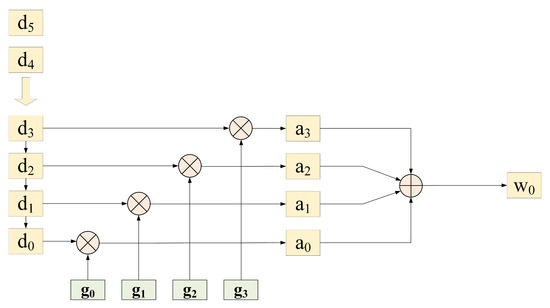 The most important calculation for implementing the Mallat algorithm is the convolution of the original data with the filter. As seen from Equation (1), the essence of the discrete convolution calculation is that the data are multiplied by the filter coefficients and then added together. Therefore, the multiplication and addition operations are split and executed in different cycles, and multiple data sets are multiplied and added in one cycle. As shown in Figure 8, only one operation is performed in different pipeline cycles, thereby effectively reducing the path delay and increasing the circuit operating frequency. Since the filter coefficients to be convolved are all decimal numbers, they cannot be stored directly in FPGA. The commonly used fixed-pointing method in engineering is adopted in this paper. The , , , and in Figure 8 are all integers after 15-bit fixed pointing.