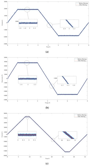 EAST fusion magnet power supply current signal filtering: (a) filtering results for 2000 A current; (b) filtering results for 4000 A current; (c) filtering results for 8000 A current.