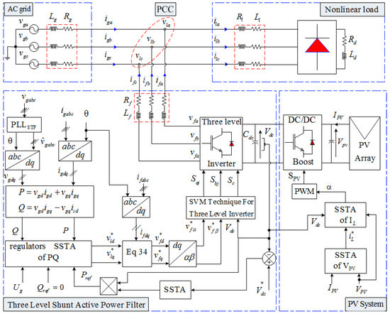 Among the different renewable energy technologies (fuel cells, wind energy, hydropower, photovoltaic (PV), or solar energy, etc.), PV-system-based distributed energy resources are considered as one of the available resources in unlimited quantities in most world regions, and the most promising technology due to highreliability in operating, efficiency, and high potential capability [3,4,5]. The use of the PV system in generating electric power helps isolated villages and regions to supply energy continuously while relying on storing surplus energy for use in critical times. Also, the use of the PV system leads to a reduction in the cost of importing energy for non-oil-producing countries, as well as reducing the cost of energy production, which makes the consumption bill somewhat low, and this is a good thing. In addition, it is free of pollutants, which have recently drawn much attention and have encouraged researchers to develop better techniques to produce a good PV system [6,7]. The highest generation level from the available renewable sources is shown by PV. In 2018, it was 36%, while all other sources were just 26% [5]. In the electrical power world, one of the major issues in connecting PV systems to the grid is resolving the power quality problems caused by the rapid increase in non-linear loads connected to the electrical grids, such as harmonic currents or voltages, reactive power, power factor, and growing demand of active power [8]. A typical grid-connected PV system is composed of a PV, a DC–DC power converter, DC-link energy storage, a three-level multifunctional voltage source inverter (MVSI)-based shunt active power filter (SAPF), a grid filter, and the control circuit. The use of SAPF in the electric power generation system helps greatly to improve the quality of power and current, which makes the periodic maintenance of the equipment less while also reducing the cost. Moreover, SAPF is an inverter, which can be two or three levels. The higher the SAPF level, the higher the quality of the current, which helps protect the devices and significantly reduces the bill for changing spare parts.