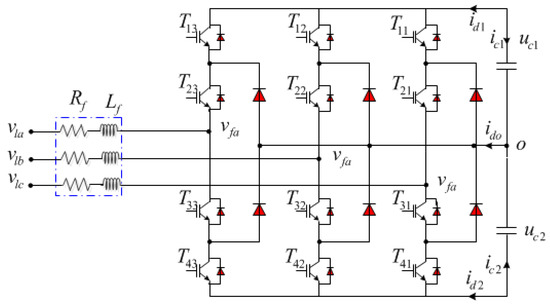 The dynamic model describing the input currents and the DC bus voltage of the three-phase three-level SAPF can be given in the reference frame as follows [52]: