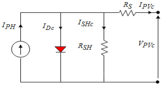 The direct conversion of sunlight energy into electricity is made possible by a solar cell that employs the photovoltaic effect observed in semiconductors with a P–N junction. The PV cell model is based on the static behavior of a standard P–N junction diode, and a circuit model of a PV cell is illustrated in Figure 3. The model includes a diode D and shunt resistance connected in parallel with a direct current source , and in series with a resistance . The calculation of the cell output current can be determined by Equation (2) [53,54,55].