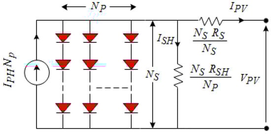 The current–voltage characteristic equation for a PV array with Ns PV cells connected in series and Np PV cells connected in parallel is given by Equation (4) and Figure 4 [56].