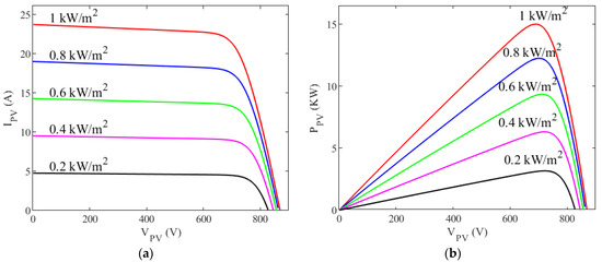 Characteristics PV array for constant temperature and variable irradiation: (a) current–voltage; (b) power–voltage.