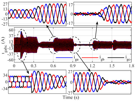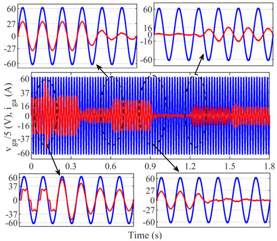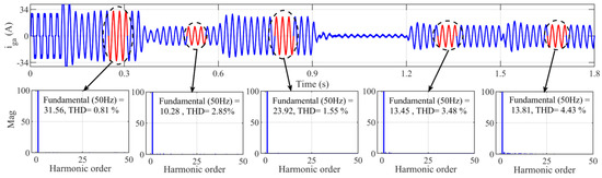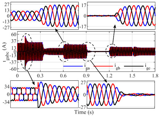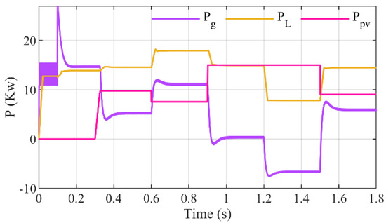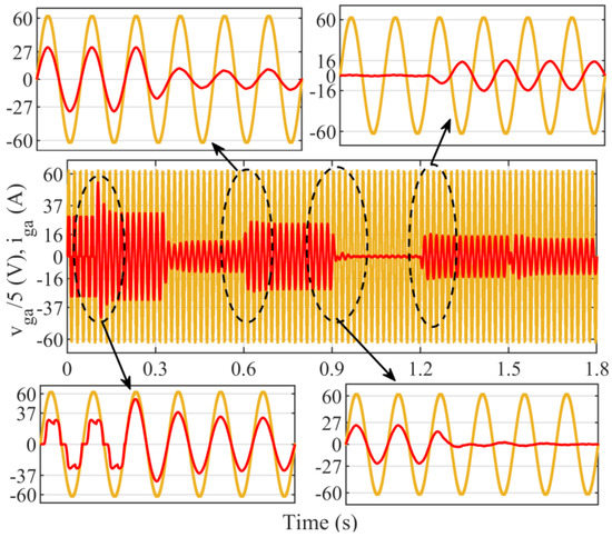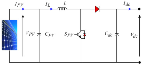 The equivalent circuit diagram for the DC–DC boost converter is presented in Figure 6. Using this diagram, the dynamical model is established through the application of Kirchhoff’s voltage and current laws, and the diagram of the voltage and current of the grid is shown in Figure 7. The differential equations describing the boost converter can be expressed as follows [57]: