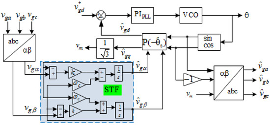A robust PLL technique is presented in [59]. It is based on the basic concept of PLL technique with introducing a multivariable filter named self-tuning filter (STF) to extract the direct component of source voltage during distorted conditions. The block diagram of the PLL technique based on STF is presented in Figure 8.