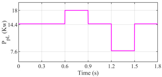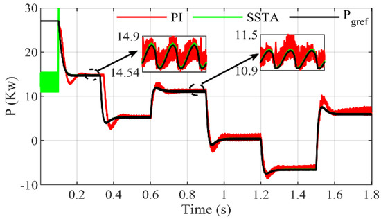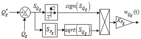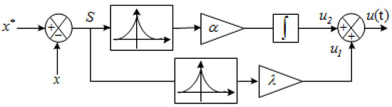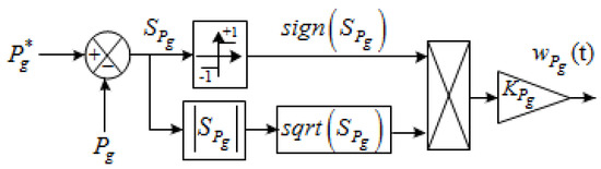 where and are the fixed proportional and integral gains, respectively (entries in vectors and ). One can easily see that the obtained equivalent controllers have a similar form to a conventional PI controller, however, with non-linear gains and . These gains are adaptive with respect to σ, and the new proportional gain is smaller than the fixed one, when , and greater than when . As a result, during the transient state (especially in the case of load change), the tracking error (which is, in fact, S) is large (, and, therefore, the gain becomes lower than the fixed gain to improve the stability of the system. The same behavior of the adaptive integral action can be noted. In fact, during transient states, a smaller gain is imposed (), to reduce sensitivity to transient disturbance. When the system reaches the sliding surface, the sliding function is zero (or almost zero); in this case, the proportional and integral actions impose gains , or s, or , offering, therefore, better steady-state performances than a fixed PI controller.
