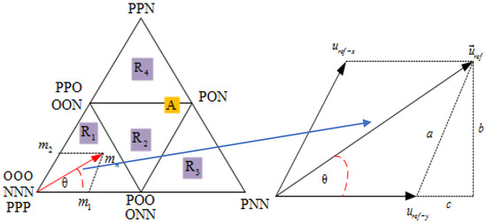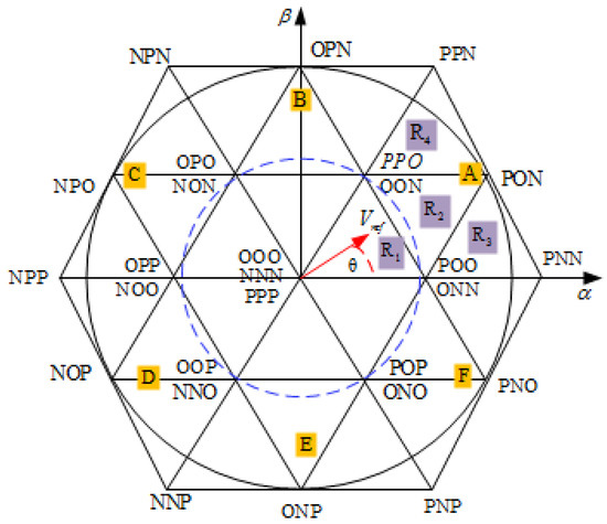 The switching states of the switches , are given with the digits ‘−1’, ‘0’, and ‘1’, respectively, indicating that the relevant arm is connected to the positive (P), negative (N), or neutral (O) points of the DC link. Connection functions, as well as the corresponding output voltages, are given in Table 1.