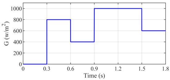 Figure 5 illustrates the computed current–voltage and power–voltage characteristics of the PV array under varying levels of irradiation and constant module temperature. These characteristics reveal that the power generated by the PV array is a non-linear function of operating voltage and has a MPP. It can be observed from the characteristics that the voltage and power of the PV array decrease as the irradiation level decreases.