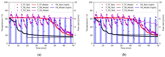 Figure 2. Comparison between experimental data and the two-volume model for a test with several water draw-offs starting from hot conditions and with the heating element disabled. (a) Numerical model considered perfect stratification. (b) Model with a mixing factor equal to 0.2. Solid lines represent results from the model, while dots are datapoints from the tests. T_TT, T_TB and T_TO represent temperatures at the upper and lower locations in the tank, and at the flow meter downstream of the tank, respectively, while FR is the water draw-off flow rate.