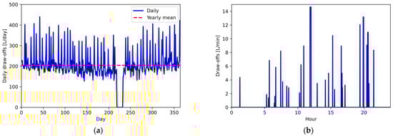 (a) Daily water draw-offs generated for the study (at 45 °C). (b) 1 min DHW consumption profile (at 45 °C) for an example day.