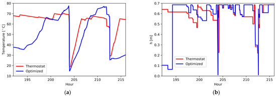 Starting with the temperature profile throughout the day (Figure 6a), there are very clear differences between the thermostat control and the optimized demand–response strategy. First, the starting temperatures (and also the level of charge of the tank according to Figure 6b) are completely different. For the thermostat control, the temperature at the top of the tank (hot volume) will only fall below the setpoint minus the temperature offset in case of a very high consumption of DHW. On the other hand, the optimized demand–response strategy from the previous day decided not to heat the water in the tank at the end of that day, meaning that the tank starts rather cold the “current” day. This could be seen as a point for improvement of the optimizing technique, since it may be actually more cost efficient to heat up the tank the previous day, depending on the hourly electricity prices of the previous and current days. In further works, the optimization could be re-evaluated as soon as the following day electricity prices are available, typically around 20:15–20:30 in the evening.