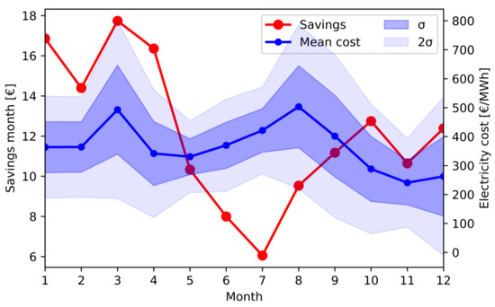 A yearly analysis was performed to evaluate the potential savings due to implementing an optimized demand–response strategy compared to the thermostat control in the ESWH. As shown in Figure 7, the monthly savings are more relevant in those months with higher electricity cost fluctuations (represented by the monthly standard deviation) and larger DHW needs (colder months, also in terms of mains water temperature). March is the month with the largest monthly standard deviation and also the largest monthly savings. August also shows very important electricity cost volatility, but it does not translate into savings. The main reason for this is that the DHW consumption profile was defined with 14 days of holidays in August, meaning that savings are half of what could be expected for a regular month with that electricity cost pattern. On the other end are May, June or July, with lower fluctuations in electricity costs, leading to lower savings. Yearly savings add up to 146 €, which is approximately 11.9% of the cost with the thermostat control. To be able to put these savings into a context, a cost estimation of implementing the electronics capable of retrieving information from the sensors in the tank and performing the day-ahead optimization based on the electricity tariffs was conducted. Depending on the capabilities of the electronics and on the economy of scale, a cost in the range of 25 € to 35 € could be expected, i.e., approximately 20% of the expected annual savings and payback well below one year. This percentage could decrease further in a future scenario in which even larger intraday price fluctuations could be expected due to the penetration of renewables. Moreover, having such a low-cost solution for ESWHs is crucial, since users buying an ESWH, which cost in the range of 170 € to 200 € in the capacity evaluated here, may not be willing to purchase additional equipment unless it pays off in a very short period.