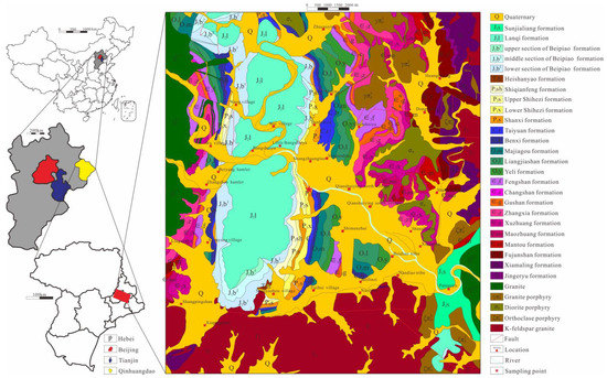 The Liujiang River Basin is an NNE syncline that is steep in the west and gentle in the east. It is situated in Shimenzhai county, 28 km to the northeast of Qinhuangdao of Hebei Province in North China, covering a total area of approximately 180 km2 [51,52]. Additionally, the Dashihe River flows into the Bohai Sea via the south of Shanhaiguan (a pass northeast of the Qinhuangdao city), resulting in the development of river terraces [53]. The current study concentrates on the Permian Shanxi Formation, which is fluvially deposited and one of the significant coal seams in the target region. It is mainly found in the regions of Shimenzhai Ximen, Xiaowangshan, and Heishanyao. The bed of interest is in conformable contact with the underlying Taiyuan Formation and the overlying Shihezi Formation, whose lithology mainly features gray, gray–black medium-fine-grained greywacke, siltstone, carbonaceous shale, and clay rock [54]. Moreover, the sampling point is mainly the positive cycle structure of rock particle size gradually thinning from bottom to top, which is characterized by a high content of quartz, some containing gravel, a great single layer thickness, the average about 1 m, a good continuity in outcrops rock, and occurrence of each stratum is similar [55] (Figure 1).