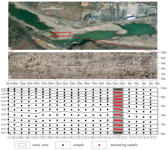 The sampling site is located in the Dashihe River valley, 500 m to the west of Shimenzhai, with less residual loose sediment on its bottom, which leads the stratum there to a thorough exposure in the dry season from March to April every year [53,56]. In addition, the sampling area is a rectangle of 42 m × 10 m, and the attitude of the bed is SE 150°, 13° (Figure 2b). The sampling area was vertically divided into 12 layers, and 21 samples were selected in each layer at intervals of 2 m horizontally. Moreover, three infilling samples were added between 10 m and 12 m in each layer to scrutinize the lateral changes of the reservoir. A total of 288 samples were thus selected, as shown in Figure 2c.