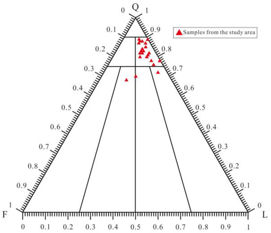 Outcrops of the Dashihe River valley in the Liujiang River Basin were mainly seen in the Permian Shanxi Formation, which has a lithology characterized by gray and gray–brown lithic quartz sandstone, followed by fine sand-bearing argillaceous siltstone, with the grain composition being quartz, less debris, and little feldspar (Figure 3). Specifically speaking, the lithology of feldspar, mainly plagioclase, was composed of debris quartz sandstone, including 78–88% quartz (average 83%), 8–22% cuttings (average 13%), and 0–6% feldspar (average 3.6%). In general, the composition of quartzes contained a small amount of chert, and rock debris is mainly igneous rock debris and a small amount of sedimentary rock and metamorphic rock cuttings.