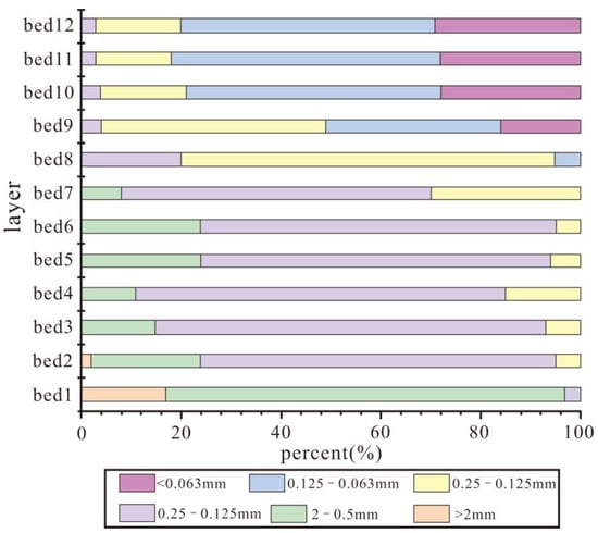 The grain size of the rock tended to be finer from bottom to top, indicating a positive-cycle-size grading (Figure 4). Additionally, strata became thinner while the sandstone particles were becoming poorly sorted and rounded from the bottom up in outcrops, with obvious distinctions in Layers 1–12. Generally speaking, the sorting in Layers 1–6 and the rounding in Layers 1–3 (sub-round-round) were the best, while the sorting in Layers 7–8 and the rounding in Layers 4–10 (sub-angular-sub-round) were moderate, and the sorting in Layers 9–12 and the rounding in Layers 11–12 (sub-angular) were the poorest. In addition, the stratigraphic contact relationship was chiefly linear, except for the point–line contact in Layers 9–12. Moreover, porous cementation could be widely identified along with a small amount of secondary enlargement, contact cementation, and basal cementation, while all strata in the target region were grain-supported (Figure 5).