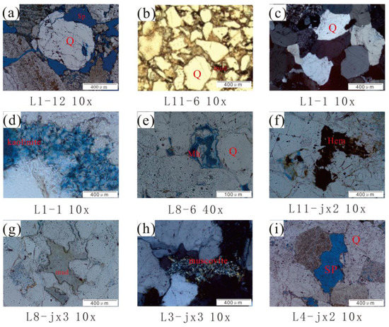 Typical thin slice photos of the study area (a)—broken quartz, (b)—high shale content, (c)—quartz secondary enlargement, (d)—kaolinite cementation, (e)—mold pore, (f)—hematite, (g)—shale cementation, (h)—muscovite cementation, (i)—macropore.