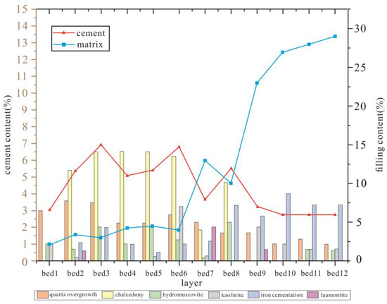 Cements were found to be quartz secondary enlargement, chalcedony, muscovite, and kaolinite. In Layers 1–8 (except Layer 7), the content of cements that varied greatly between layers was higher than that of matrices, whose content was approximately 2–15% with an average of 11.3%, while the content decreased to 6–7% with an average of 6.7% and contained inconspicuous changes, which were far less than that of the matrices in Layers 9–12 (Figure 6).