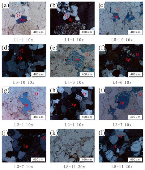 The total content of matrix was about 2–29% in total; it was mainly argillaceous and with few silty. In Layers 1–8, the lithology of this section was quartz sandstone, and the matrix content was 2–13% with an average of 5.53%. Meanwhile, the lithology became argillaceous siltstone in Layers 9–12, and the content rose to 23–29% with an average of 26.8%. As the rock’s particle size gradually becomes finer, the lithology changes to argillaceous siltstone, and the content of the argillaceous matrix becomes higher.