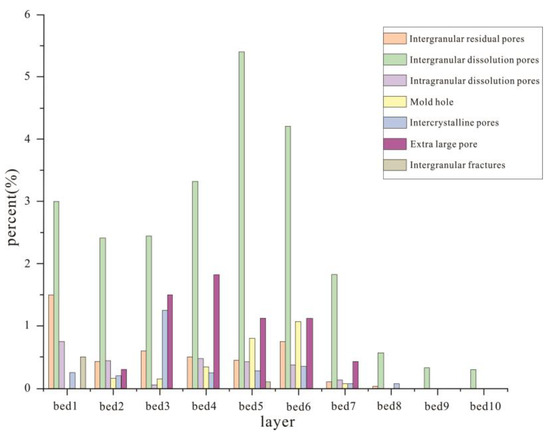 Bar diagram of pore types and content of each reservoir in outcrop area.
