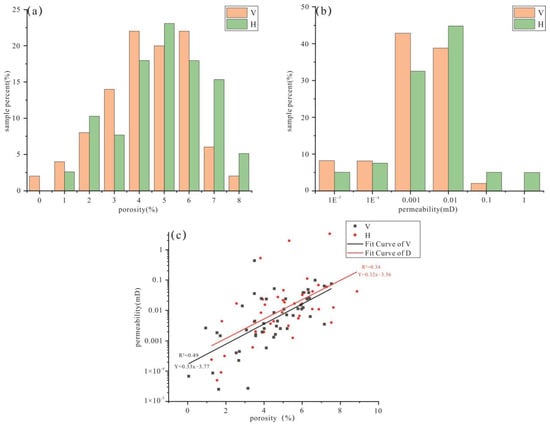 The permeability of those samples ranged below 0.098 mD, with an average of 0.023 mD. Among them, the permeability in the V direction was between 0.00007 mD and 0.09857 mD, mainly in the range of 0.001–0.1 mD, with an average of 0.0157 mD. In the H direction, the permeability was between 0.00005–0.3375 mD, mainly in the range of 0.001–0.1 mD with an average of 0.16289 mD. By and large, principal distribution intervals in both directions exhibited the same tendency, with the average and maximum permeability in the H direction being greater than those in V (Figure 9b).