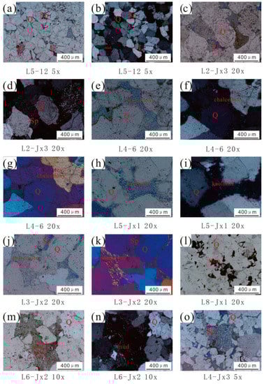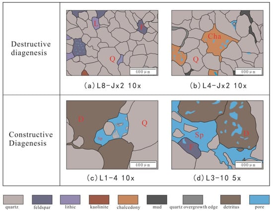 Siliceous cementation, including quartz cementation (Figure 10c,d) and chalcedony cementation (Figure 10e–g) in the target region, plays a role in degrading the sandstone reservoir quality [74,75]. Quartz cementation was characterized by the quartz secondary enlargement, resulting from the dissolving enlargement due to later dissolution, which completely or partially wrapped quartz particles in the reservoir and mostly filled in intergranular pores with a small number of microcrystals in dissolved pores. On the other hand, chalcedony seemed to be radial, fibrous, and granular aggregates in the thin-section microscope photos, and the interference color changed to blue and yellow after adding the gypsum test board. Generally speaking, all siliceous cements blocked pore-throat space, deteriorating reservoir physical properties.