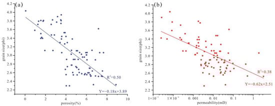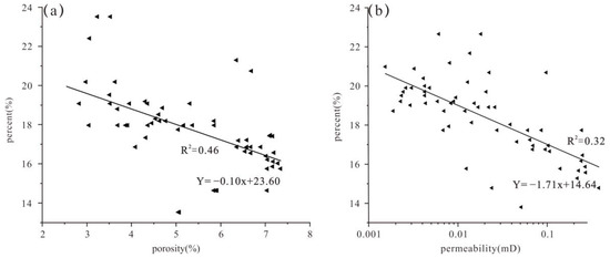 As the material basis of reservoir development, sedimentation, including clastic particle size, sorting, grinding, etc., has a substantial effect on reservoir physical properties as well as its diagenesis [82,83]. Source materials provided sufficient provisions for the target reservoir, the bottom of the Shanxi Formation, whose continental fluvial facies resulted from moderate tectonic movements without uneven landform and strong water forces, where a brief intrusion of seawater occurred at the same time [84,85]. Additionally, the positive cycle in the target reservoir was apparent despite its unchanging sedimentary microfacies from the bottom to the top, whereas grain sizes varied with the increasing distance from the water source. It was characterized by medium coarse- and lithic-bearing quartz sandstone in Layers 1–8, and fine sand-bearing argillaceous siltstone in Layers 9–12. Following a careful investigation, it was possible to conclude that the reservoir’s porosity and permeability dropped with the decrease in rock grain size (Figure 11a,b), since coarser rock-grain size, a more sophisticated structure, and lower shale content would lead to a stronger capacity to withstand the formation pressure and better physical properties, contributing to the preservation of primary pores [86,87].