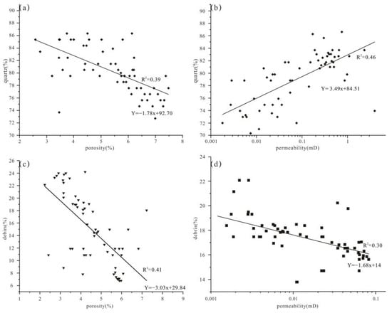 (a) Relationship between porosity and quartz content; (b) Relationship between permeability and quartz content; (c) Relationship between porosity and rock chip content; (d) Relationship between permeability and rock chip content.