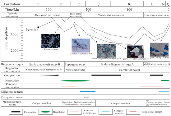 - Cao, T.S.; Luo, L.; Tan, X.F.; Tan, D.P.; Sun, X.; Gao, Z.P.; Wang, J.; Cha, X.J. Genesis and pore evolution of tight sandstone reservoir:taking Lower Shihezi Formation in the Shilijiahan block of Hangjinqi area as an example. Fault-Block Oil Gas Field 2021, 28, 598–603. [Google Scholar]