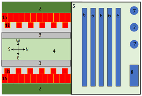 Mutual location of houses, garages (1a, 1b), gardens (2), streets (3), flower beds (4) and hybrid generation/storage system area (5): 6—PV modules; 7—wind turbines; 8—energy storage (own review).