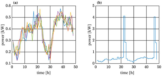 In accordance with the data published on the operator’s website (ENEA company) [25], it was assumed that each house consumes 3500 kWh of electricity per year, according to the load characteristics of the G11 tariff for individual consumers with a contracted capacity of no more than 40 kW determined for the entire year with a step of 1 h. To represent the actual operating conditions of the consumers (24 houses), a random modification of the load characteristic of each house was used in the form of noise, with a normal distribution with mean value equal to , variance equal to and amplitude equal to kW. Depending on the variant of calculations, power resulting from electric vehicle charging processes was added to the house loads. Figure 2 shows the family of randomly modified load characteristics of the G11 tariff as of 01.01.2021 (a) and the selected load characteristic taking into account the charging of an electric vehicle (b).