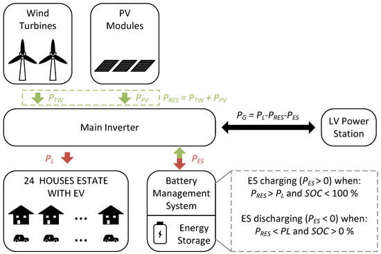 General structure of a generation system with electrochemical energy storage designed to supply a group of detached houses (terraced houses), taking into account the charging of electric vehicles (own study).