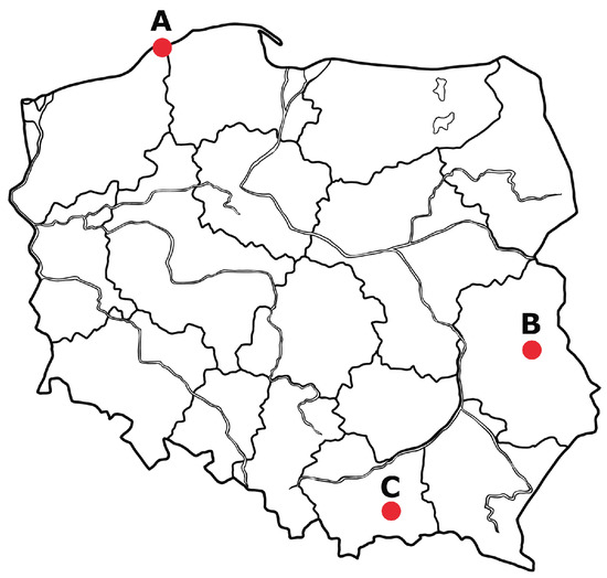 Locations in Poland for which optimisation calculations of the hybrid generation system are carried out (A—Baltic coast, B—Lublin Uplands and C—Carpathian Foothills).