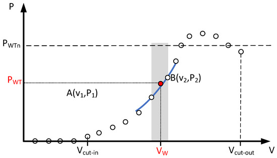 where , —wind speed from the wind turbine power discrete characteristics, where the wind speed falls in between; and —wind turbine power values corresponding to wind speed and ; and —wind speed which enables reaching the wind turbine rated power .