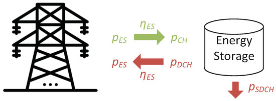where —the average power of the energy storage taken from or returned to the grid (at the output of the power electronic systems) for the i-th step and —the charging and discharging efficiency of the energy storage.