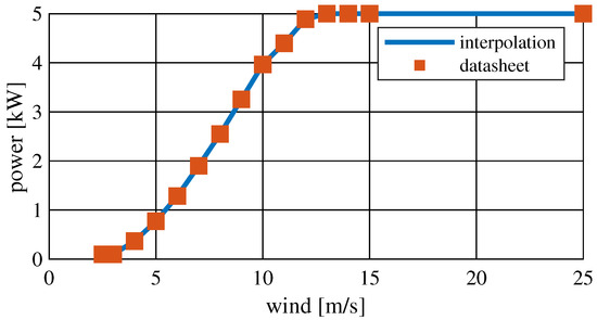 In accordance with (3), linear interpolation is used to determine power . Figure 5 shows the discrete power characteristic of the wind turbine with the above-described characteristic points and the linearly interpolated characteristic area (green section).