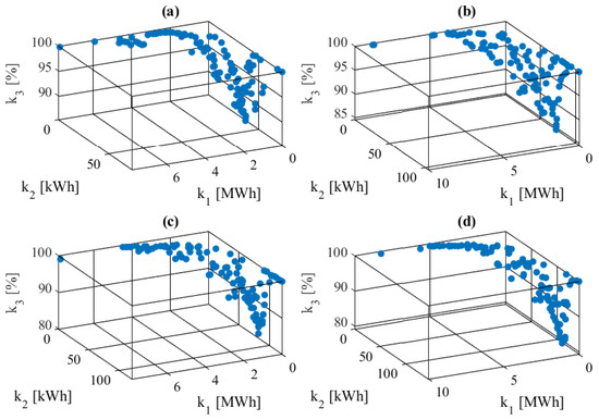 Vehicle charging processes are taken into account by the addition of a constant power, with a value and duration ensuring that the vehicles are topped up to SoC = 100%, at randomly determined times in the afternoon and at night. The maximum charging powers for each vehicle, depending on the charger (3.6; 7.4; 11 or 22 kW), are selected at random. The results of the optimisation of the variants indicated above for location A, in the form of Pareto fronts in the three-dimensional space , and , are shown in Figure 8.