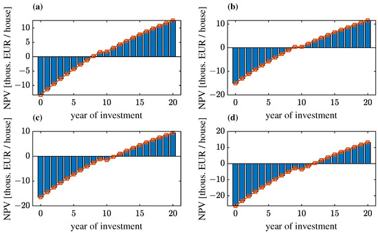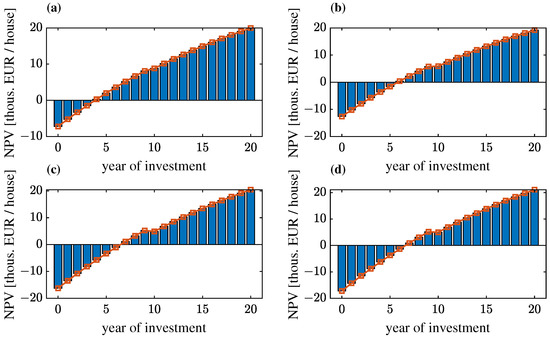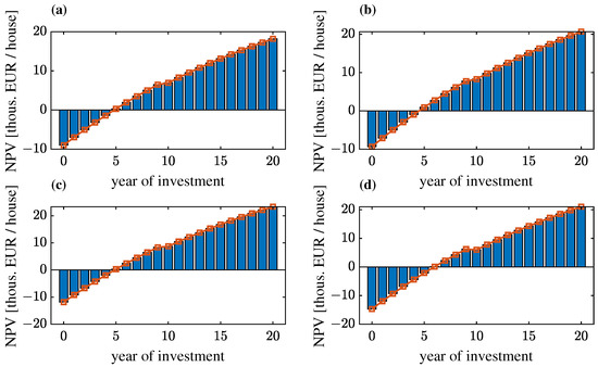 Changes in NPVs (per house) as a function of year of operation for the final solutions of the optimisation task for location A of the system and load scenarios taking into account different development of electromobility: (a) 0; (b) I; (c) II; (d) III.