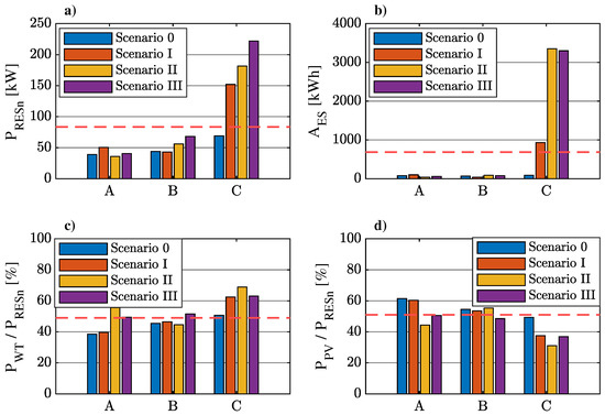 Figure 12 provides a comparison of the rated power Pn of the system, the energy storage capacity AME and the percentage share of the power of PV and wind sections for the final solution, as well as the locations considered and the electromobility development scenarios. The dotted lines in the figures indicate the average values.