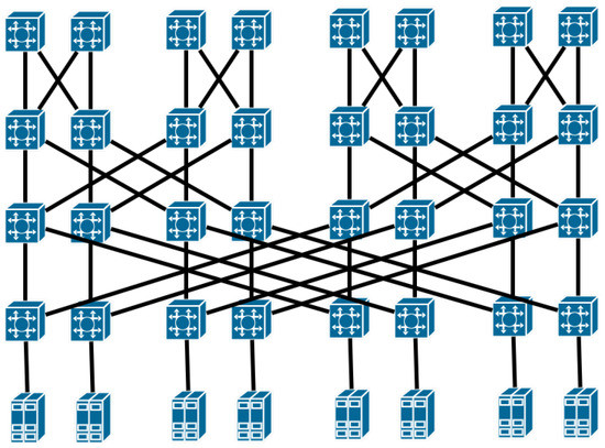 The network topology is vital to network performance and reliability [1,14]. It determines the length of network paths and backup connections that can be used in the case of failure. In general, network architectures employing simple topologies, i.e., tree, complete graph, or star, do not allow for an adequate level of reliability and scalability to ensure the efficient operation of a large data center. In the case of the tree topology, the failure of even a single switch results in an inability to communicate some servers due to the lack of backup paths. This problem does not occur in the complete graph topology. A path passing through any other computing node can be used. The number of connections equals , where n denotes the number of network nodes. However, ensuring the direct connection between each pair of nodes in the data center network is costly. The lack of switches forces the need for a large enough number of ports to handle all existing connections to a given server. Using a single switch in the star topology creates a single point of failure in the network. Moreover, it is also difficult to scale such a network due to the limited number of switch ports.