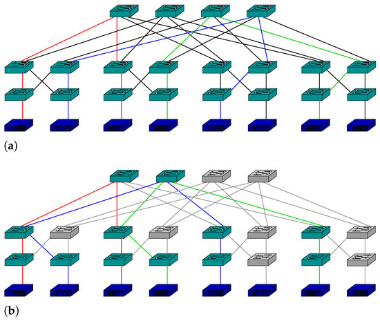 The DCN topologies presented in Section 2.1 exhibit significant redundancy, leading to excessive power consumption in periods of reduced traffic. In such a case, the flows may be routed over a limited set of paths engaging only some of the links and switches—see Figure 2a. One may switch unused equipment into low-power standby mode to save energy. However, further savings may be attained by harmonizing energy-aware functions globally, especially incorporating them into routing. Typically for DCN networks, there are many equal cost paths. Standard routing algorithms use path length metrics and tend to spread the load evenly, as shown in Figure 2a. Energy-aware routing should behave differently thanks to incorporating power consumption into a given metric—it consolidates paths on a minimal subset of nodes and links, as shown in Figure 2b.