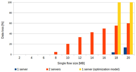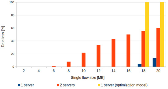 Packet loss was not present for flows up to 16 MB, while for larger flows it was present, due to the insufficient link capacity. For the same reason, the mathematical programming task for the respective setup was infeasible, conventionally denoted by the 100% loss level. It can be seen that the advantage of heuristics is the possibility of determining an approximate solution also for cases not supported by the mathematical model. In the case of two servers, a solution using heuristics achieves slightly better QoS for the butterfly topology. It is an obvious result of the greater freedom of choosing paths at the lower level of the graph built with a significantly larger number of devices than in the case of the fat-tree. Since the losses for 8 MB flow and fat-tree networks are relatively small and completely absent in the case of one server, this value was selected for further experiments.