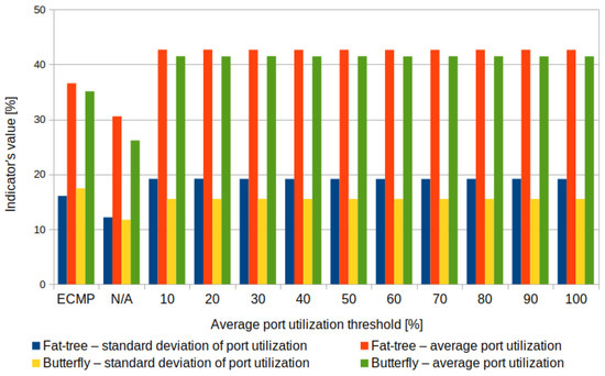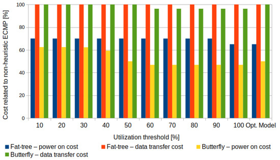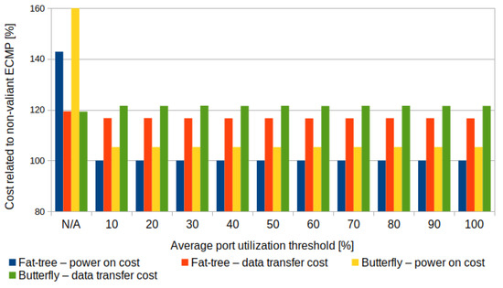 The proposed heuristic allows a greater energy gain for a butterfly topology than a fat-tree one. In particular, it is caused by a higher number of devices placed in the additional layer of the network. This resulted in higher energy consumption compared to that of the fat-tree topology. Analysis of individual cost components for ECMP routing without energy-saving heuristic and both topologies are presented in Table 2. Setting a high port load threshold can result in packet loss, especially at higher levels of hierarchy, as the switches there located aggregate flows gathered by lower level nodes. Passing a path through such a switch can redirect flows to an excessively loaded part of the network, which results in a high loss rate. However, even conservative settings of port load threshold—in the range of 40–50%—allow visible savings and provide the headroom for burst traffic.