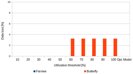 Simple topologies with one server attached to the switch at the lowest level were considered to investigate the node activation heuristics. The constant flows of 8 MB were generated. The solution obtained for the ECMP algorithm without energy management heuristics was used as a reference point. It defines 100% energy consumption level in Figure 5. The tested heuristic algorithm activates additional switches if exceeding a given port load threshold. It allowed for a significant reduction of device activation energy costs. However, the costs of handling flows remained unchanged in most test cases. The cause for this is that, assuming the same data transfer costs through all devices, the path determined by the ECMP algorithm itself has the lowest transmission cost. Thus, the only source of savings may be placing all unused modes into sleeping mode. The reduced transmission cost, recorded for larger threshold values and butterfly topology, is not an actual profit but is the side effect of data losses presented in Figure 6. Significantly, the energy usage was also lower than for smaller values of the threshold and lower than the optimal solution found with the MIP solver. This testifies that the number of active switches was, in this case, insufficient.